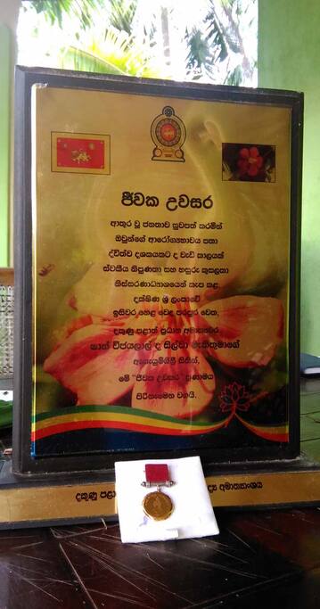 【写真】前スリランカ大統領から生前時、アーユルヴェーダ医師であった、ロシャン宅奥さんのお父様への感謝状。